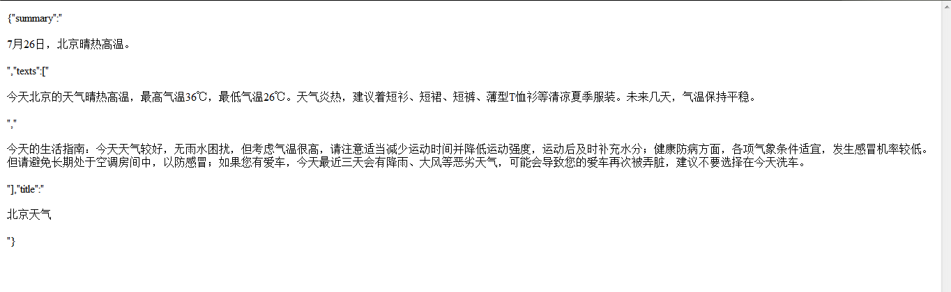 {"error_code":0,"error_msg":"","result":{"texts":["\u4eca\u5929\u5317\u4eac\u7684\u5929\u6c14\u6674\u70ed\u9ad8\u6e29\uff0c\u6700\u9ad8\u6c14\u6e2936\u2103\uff0c\u6700\u4f4e\u6c14\u6e2926\u2103\u3002\u5929\u6c14\u708e\u70ed\uff0c\u5efa\u8bae\u7740\u77ed\u886b\u3001\u77ed\u88d9\u3001\u77ed\u88e4\u3001\u8584\u578bT\u6064\u886b\u7b49\u6e05\u51c9\u590f\u5b63\u670d\u88c5\u3002\u672a\u6765\u51e0\u5929\uff0c\u6c14\u6e29\u4fdd\u6301\u5e73\u7a33\u3002<\/p>","